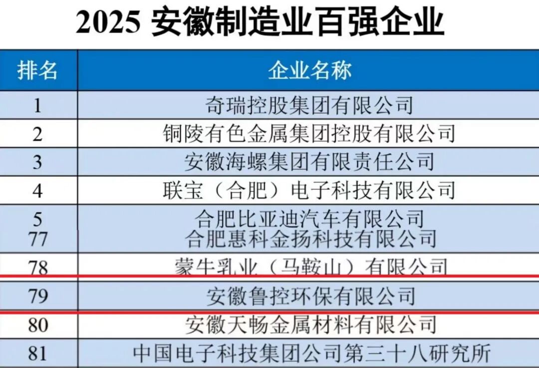 近日,“2025年安徽制造業百強企業”榜單正式揭曉,山東環保集團權屬安徽魯控環保有限公司連續三年榜上有名。